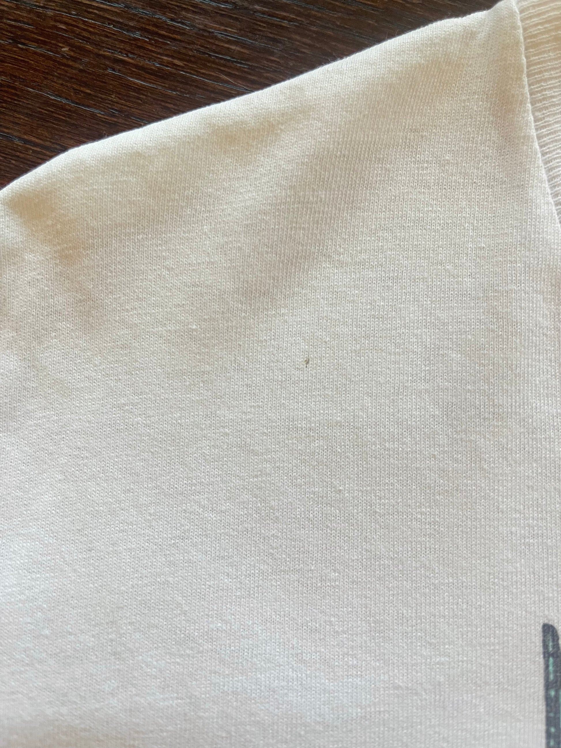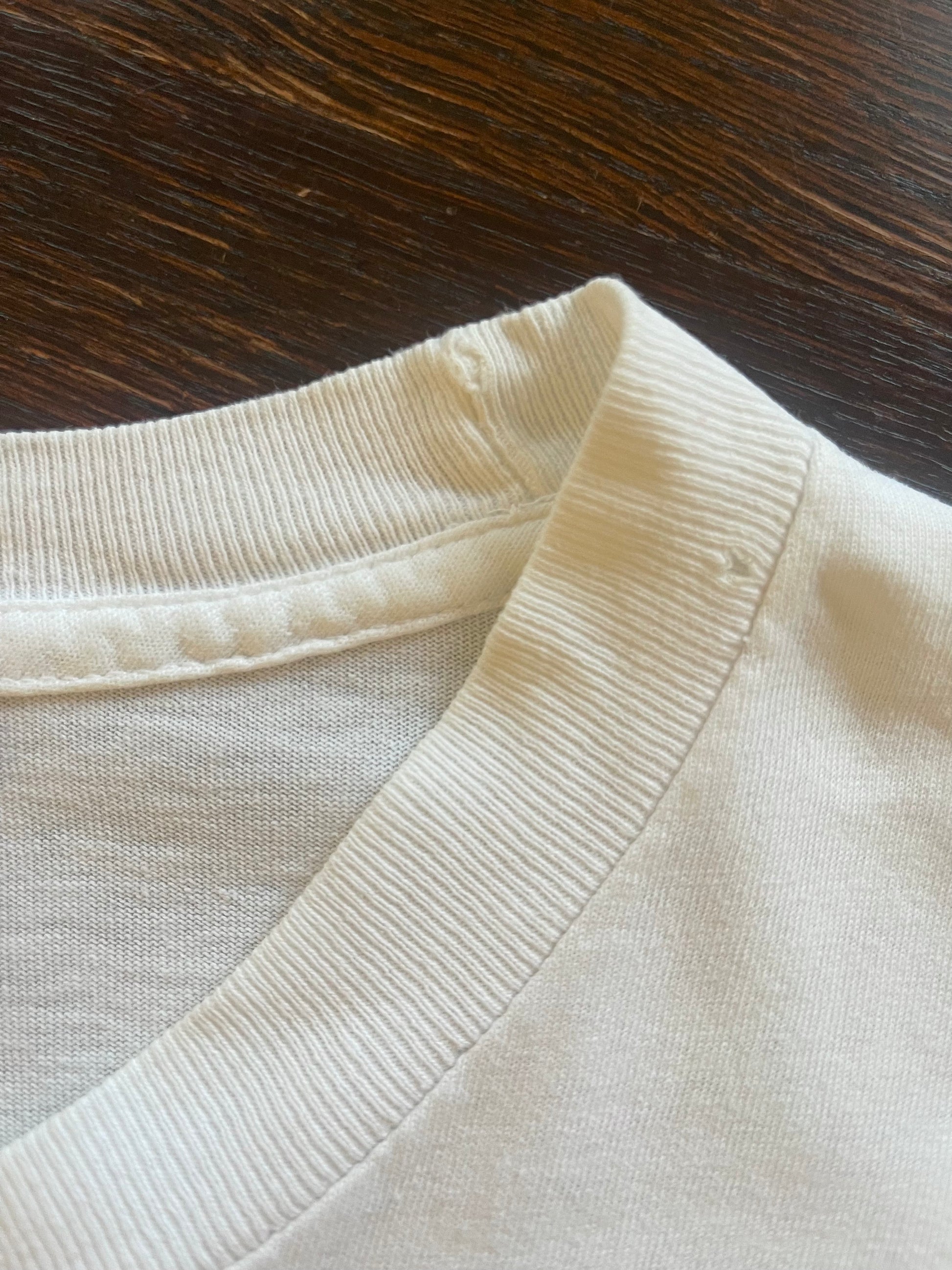 Despite these signs of wear, the T-shirt remains fully wearable, and the imperfections are difficult to notice when worn.