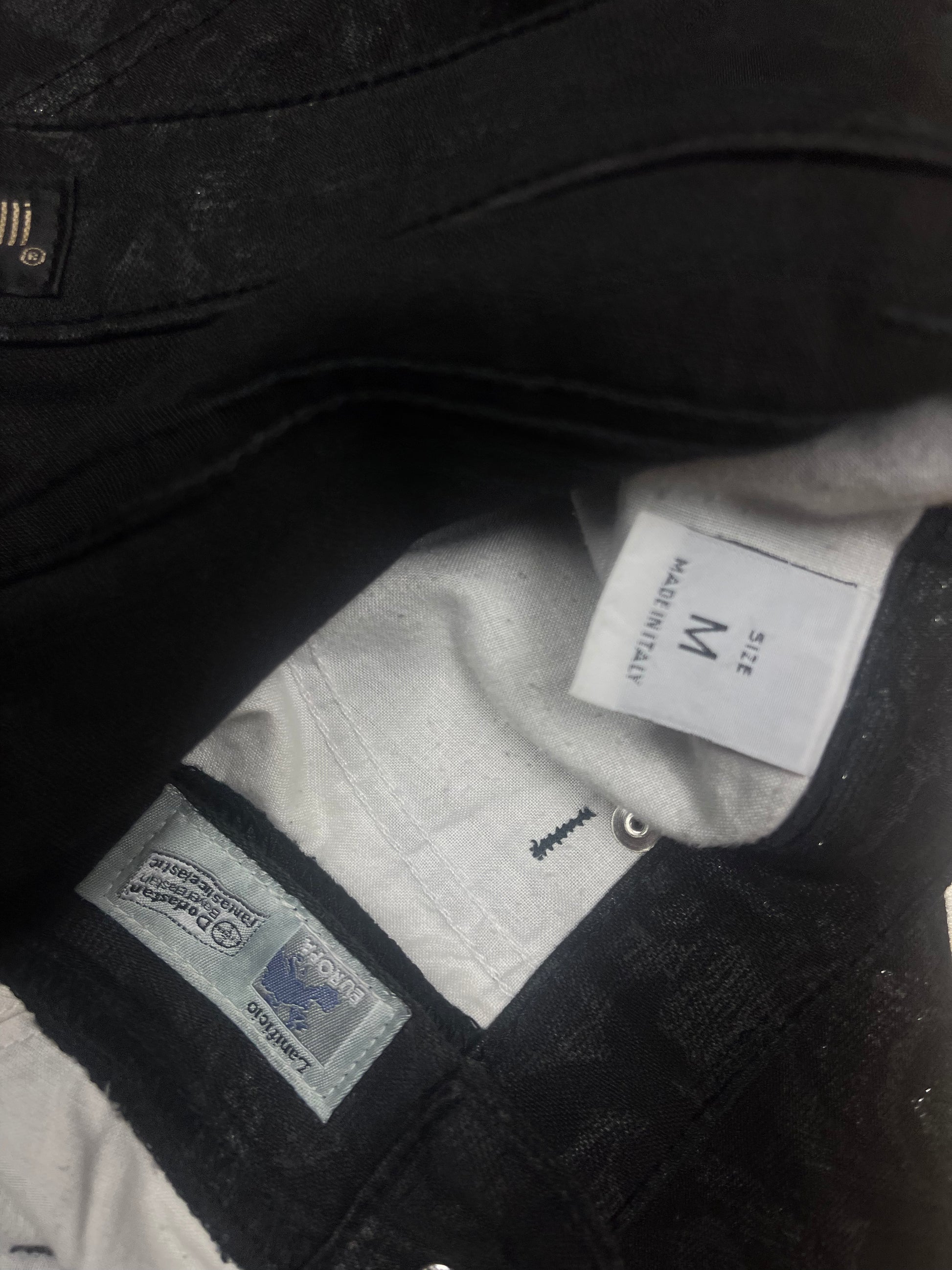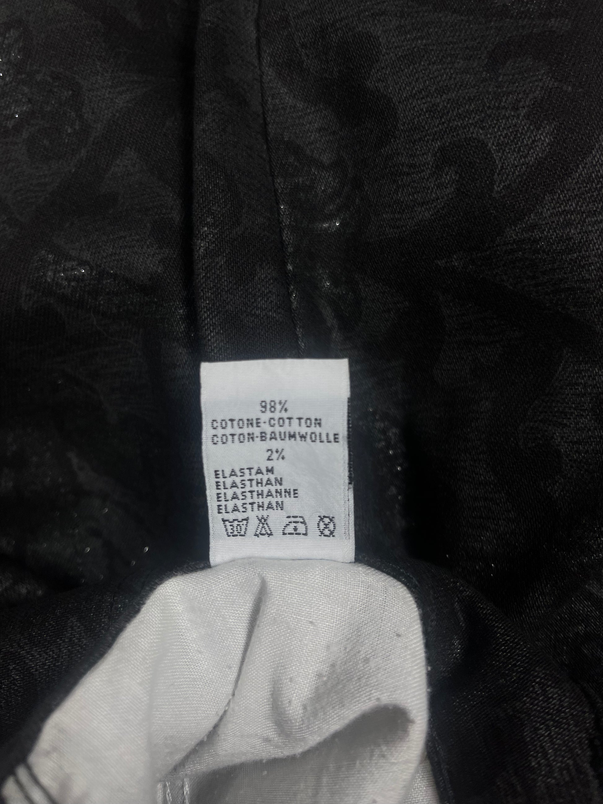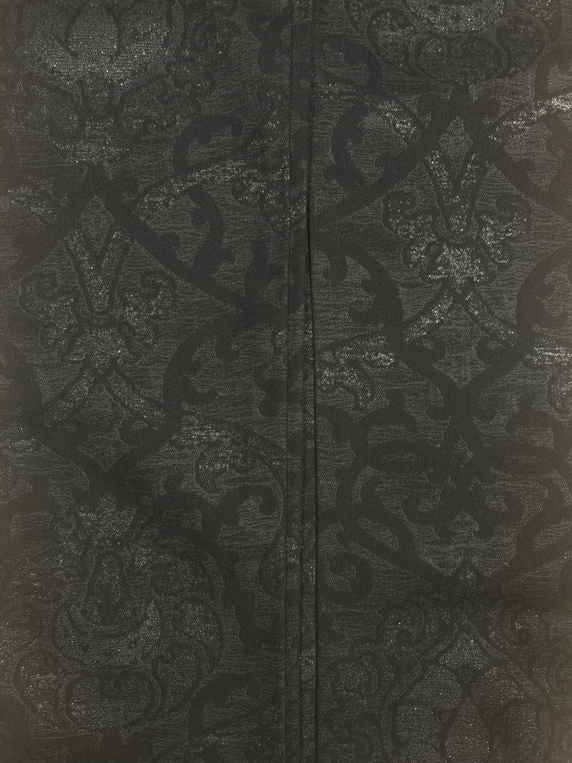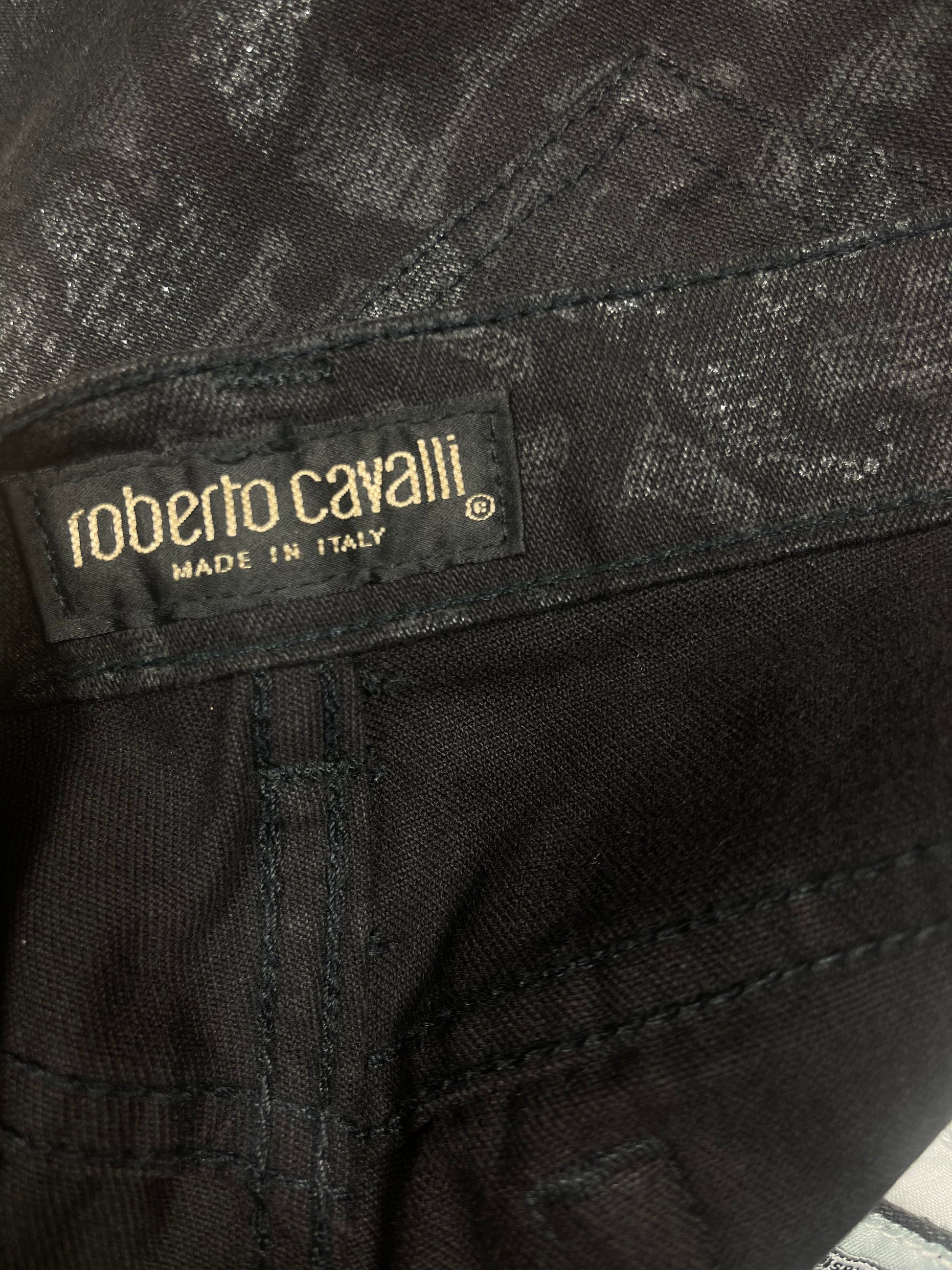 Y2K Roberto Cavalli Pants Jeans Size M Made in Italy Mid-Rise Waist Black Baroque Glitter Metallic Shimmer Cotton Elasthan