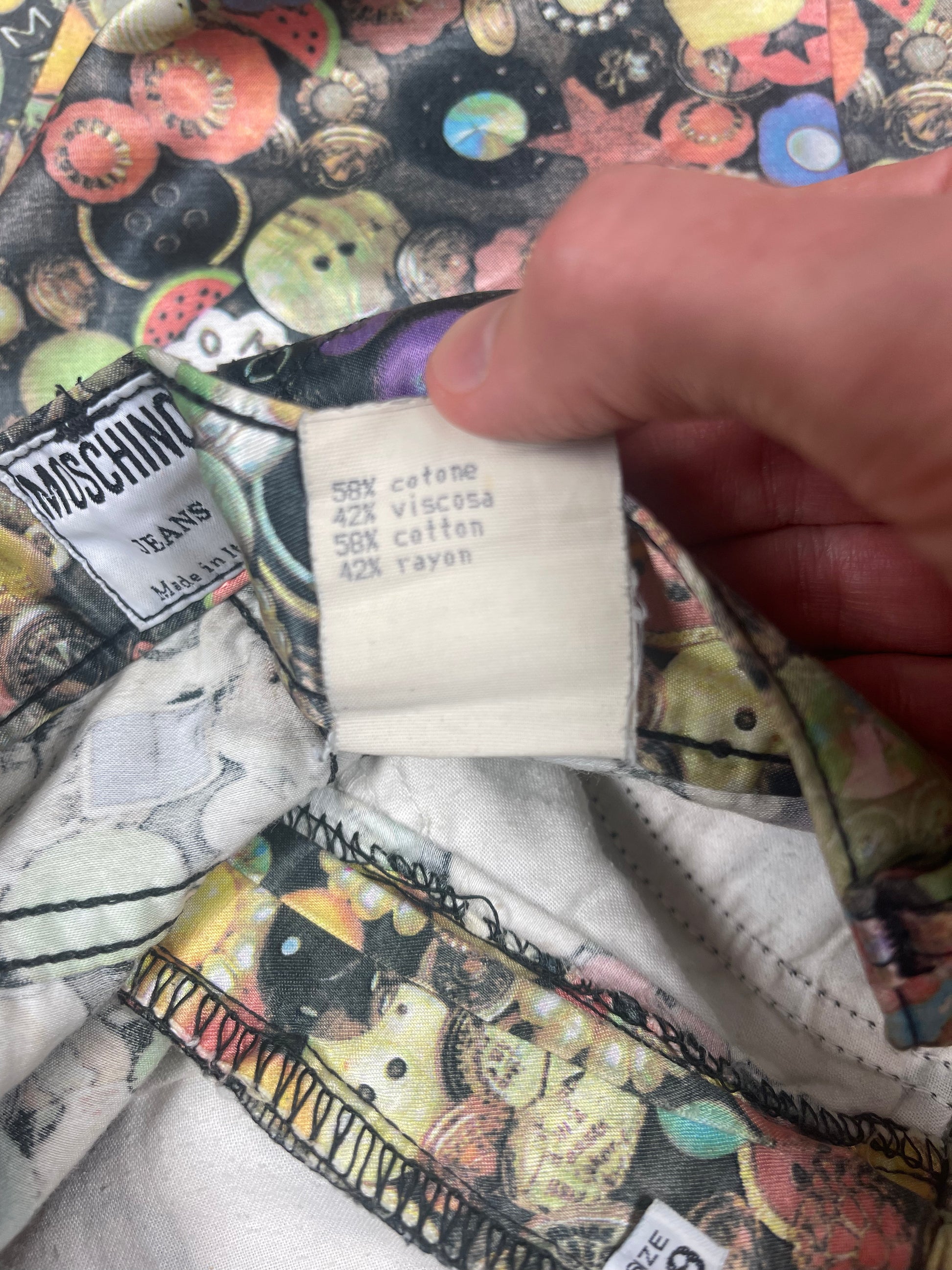 Vintage 90's Moschino Pants Trousers Made in Italy Cotton Rayon Shiny Buttons Pattern Size 29