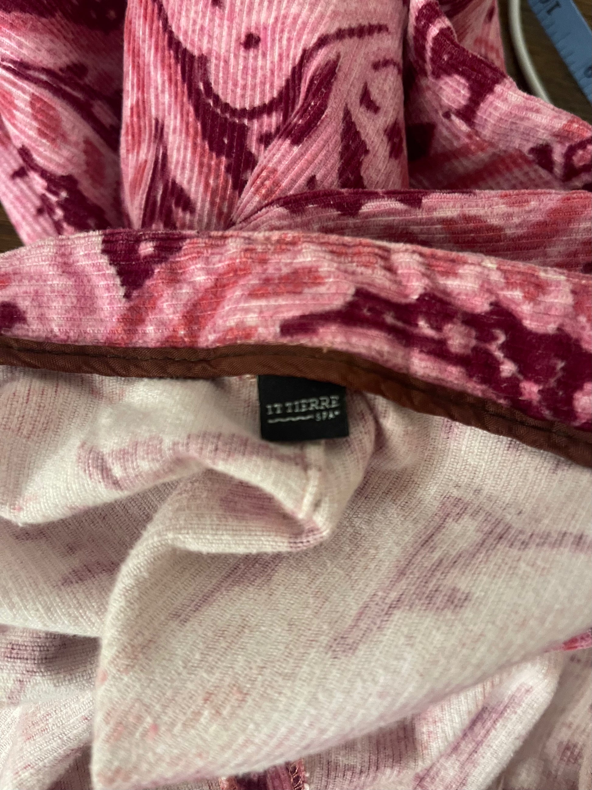 Corduroy fabric in vibrant bubblegum pink and plum tones, adorned with a reinterpreted paisley pattern. Traditional oriental motifs are stylized into sweeping, organic curves reminiscent of the fluid lines of Art Nouveau. The result is an exuberant print with a retroāpsychedelic flair, yet carrying the ornamental elegance of the early 20th century